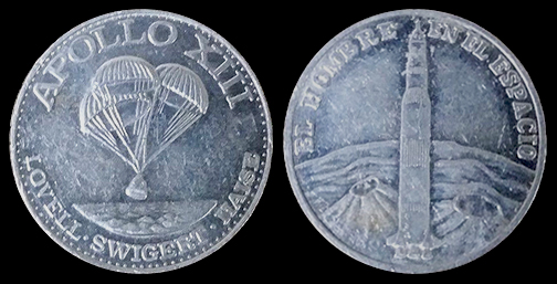 Below: Apollo XIII aluminum coin from the Shell Oil 'Man In Space' promotion released in Mexico. |
